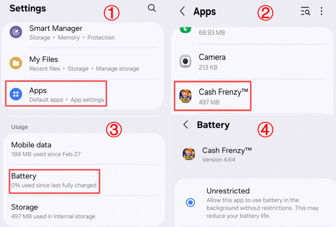[Open your device Settings and tap Apps > Select Cash Frenzy > Tap Battery > Select Unrestricted]