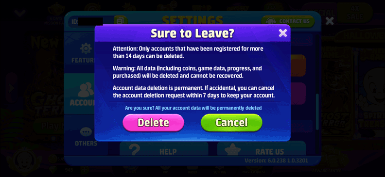 1. Account deletion will clear all data under your current account, including recharge, items, etc. If you have unused virtual items such as virtual coins or paid functions under your account, please use them before deleting your account. All unused virtual items such as virtual coins or paid functions will be cleared together with the account after the account is deleted, so please proceed with the deletion request with caution.