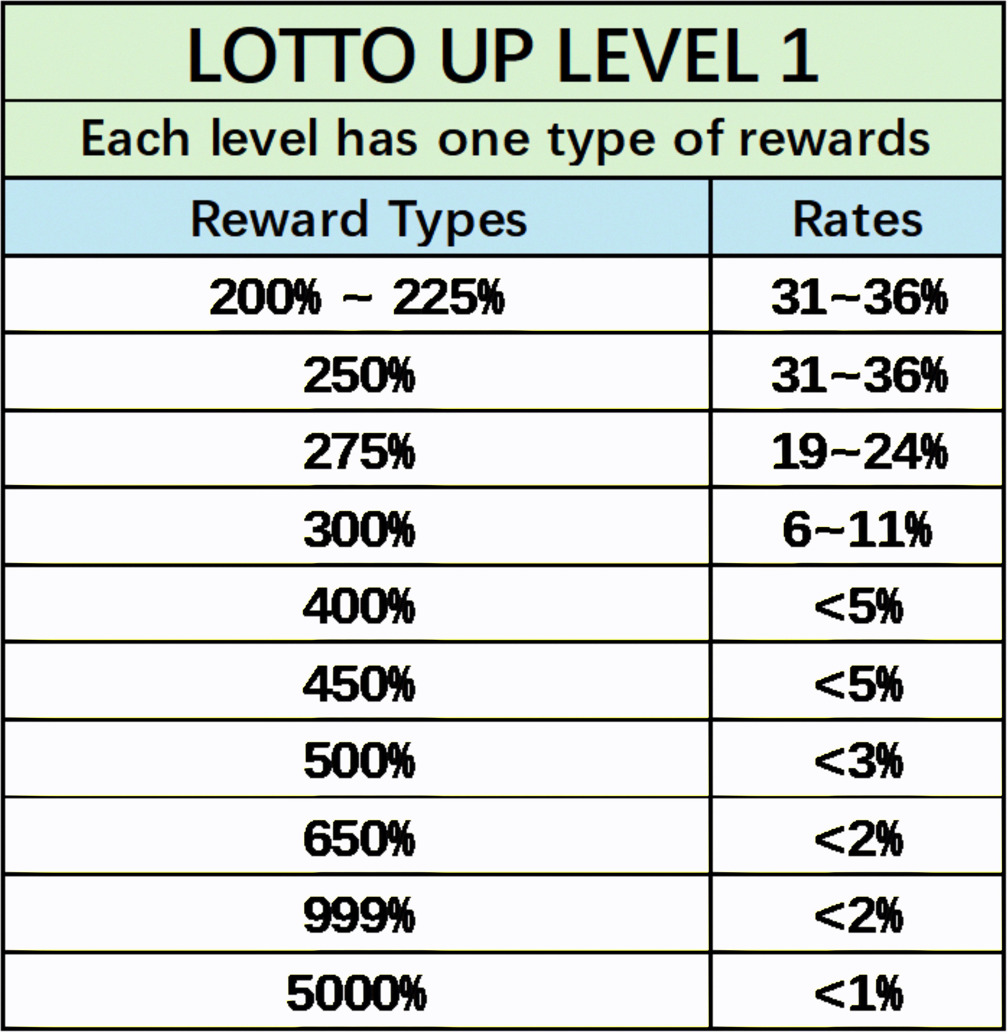 The following charts indicate the prize drop rate chance for each level of LOTTO UP.
